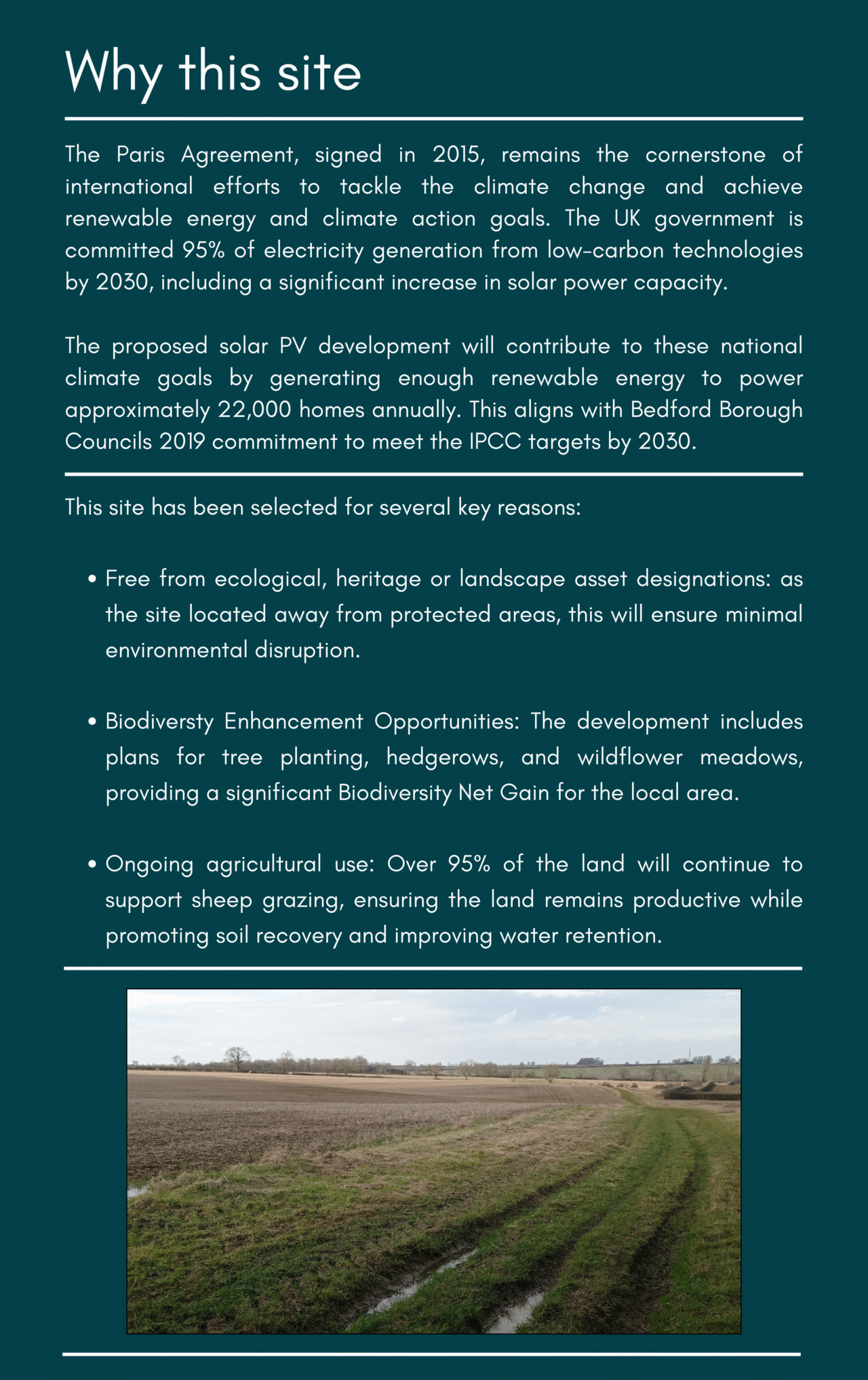 Lime Kiln is a proposed 49.5MW solar PV project, located west of Wymington and north-east of Poddington, Bedfordshire. The Proposed development would be located on approximately 193 acres of land which is currently in predominantly arable agricultural use. Lime Kiln is part of a wider development which includes its sister site: Bottom Railway, together delivering upto 75.9MW.